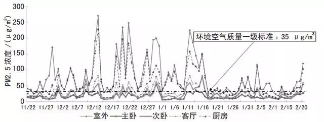 分別在主臥、次臥、客廳、廚房和室外各放置1 臺PM2.5 顆粒物濃度數據采集儀進行同步、連續測試,一共 5 臺。數據采集設備為美國 TSI 某型號測試儀器,量程范圍 5~300 μg/m3,設定每隔 5 min采集數據一次,自動記錄存儲數據。