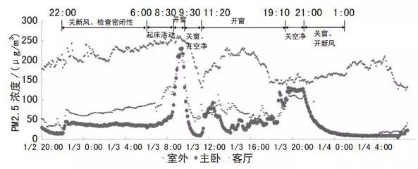 為了進一步分析新風系統和空氣凈化器的除霾效果,實驗對比了新風系統和空氣凈化器的除霾效果。選擇了空氣質量污染嚴重的日期,2016 年 1 月 2—4 日日均濃度高達 189 μg/m3進行測試。首先了解室外 PM2.5 通過圍護結構縫隙滲透進入室內的情況(主要為門窗縫隙),為減少人體室內活動、入戶門和陽臺門的開閉等人為因素的影響,選在夜間22:00—次日 06:00 家人睡覺期間評價外圍護結構滲透情況,1月 2 日晚上 22:00 關閉新風系統,如圖 4 所示,在關閉新風的 15 min 以內,主臥、客廳的 PM2.5 濃度均明顯提高,隨后 8 h 內,主臥濃度基本維持在 35 μg/m3不變,說明主臥房間密閉性好。而客廳與室外側連接面較多因此密封性稍差,濃度從 60 μg/m3緩慢上升到 90 μg/m3。次日早上 06:00 起家人陸續起床,主臥和客廳濃度上升加快。08:30 起全部臥室窗戶和陽臺門略微開啟(1/5 開),PM2.5 濃度急速上升,在1 h 后,主臥濃度從 69 μg/m3上升至 227 μg/m3,客廳濃度從 120 μg/m3上升至 200 μg/m3,此時室外濃度為 250 μg/m3,室內外濃度相差無幾。