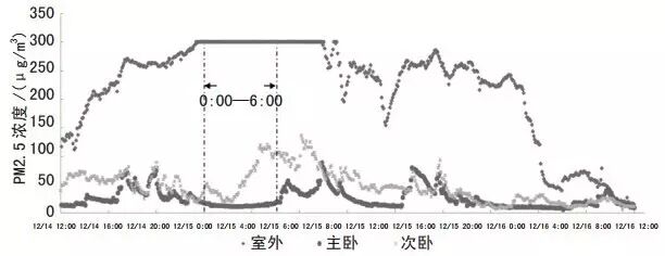筆者在 12 月 15 日早晨 06:00 起床時發現,主臥 PM2.5濃度為 19 μg/m3,但是次臥污染嚴重,PM2.5 濃度高達133 μg/m3。推開陽臺門走出室外,外面正刮著強勁的北風。查看數據記錄發現,12月15日 00:00—06:00,室外 PM2.5 濃度爆表,可記錄的室外 PM2.5 濃度為 300 μg/m3,如圖6所示。在 00:00 時刻,主臥 PM2.5 濃度為 15 μg/m3,次臥為35 μg/m3,午夜 00:00 過后,受強勁北風影響,截至 06:00 位于北面的次臥室內 PM2.5 濃度上升至 133 μg/m3,而主臥位于南面受北風影響較少,室內 PM2.5 濃度波動較小。因此可見室內 PM2.5 濃度受室外風壓影響較大。
