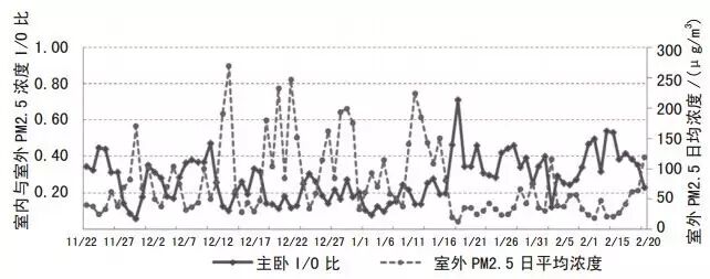 I/O 比定義為室內與室外顆粒物濃度的比值,直接反應了新風系統的 PM2.5 凈化效果。I/O 比越小,說明新風凈化效果越好。以凈化效果******的主臥 I/O 比為例說明,如圖 3所示,I/O 比曲線變化趨勢與室外 PM2.5 濃度曲線變化趨勢相反,室外空氣污染越嚴重、I/O 比越低,說明新風凈化效果越好。例如污染***嚴重日12月15日 I/O 比為 0.1,空氣質量******日1月21日 I/O 比為 0.71。
