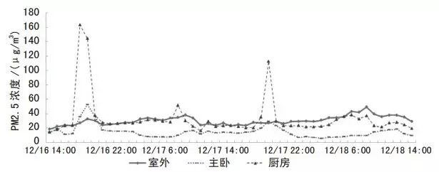 為更加客觀評價廚房烹飪對室內 PM2.5 濃度的影響,選取室外空氣質量良好的時間段進行數據分析。圖 5 為 12月 16 日 14:00—18 日 14:00 室外、客廳和廚房 PM2.5 小時平均濃度變化曲線圖,室外 PM2.5 平均濃度為 30 μg/m3。2天當中廚房 PM2.5 濃度******值均出現在傍晚 19:00 左右,這正是每天晚餐烹飪時間,與房相鄰的客廳 PM2.5 濃度會相應升高。