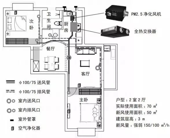 本實驗測試場所為上海浦東新區某小區某 2房 2廳公寓房,2011年新房裝修時安裝了某品牌全熱交換雙向流新風系統,無 PM2.5 凈化功能,2014年6 月對系統凈化功能進行升級改造,在全熱進風側增加1臺該品牌的 PM2.5 凈化風機,使得系統 PM2.5 凈化率可達 85%~90%。系統設計如圖1所示,主臥、次臥和客廳(含餐廳)分別獨立設置進風口和排風口,廚房和衛生間無新風。設計風量為 100~150 m3/h,換氣次數為 0.7~1 h-1。為驗證空氣凈化器 PM2.5 凈化效果,主臥、次臥和客廳分別放置1臺空氣凈化器,主臥、次臥各放置該品牌V70 空氣凈化器1臺,客廳放置某其他品牌空氣凈化器 1 臺。