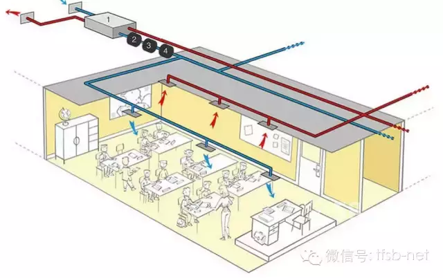 家用新風系統是由風機、進風口、排風口及各種管道和接頭組成。安裝在吊頂內的風機通過管道與一系列的排風口相連,風機啟動,室內受污染的空氣經排風口及風機排往室外,使室內形成負壓,室外新鮮空氣便經安裝在窗框上方窗框與墻體之間)的進風口進入室內,通風系統從而使室內人員可呼吸到高品質的新鮮空氣。
